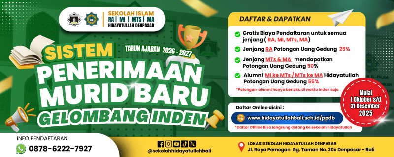 Sekolah Islam Hidayatullah Denpasar kembali membuka SPMB (Sistem Penerimaan Murid Baru) Gelombang Inden Tahun Pelajaran 2026/2027 untuk semua jenjang: